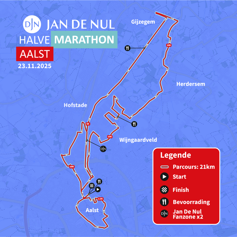 Op zondag 23 november 2025 nodigen we lopers van alle niveaus uit voor een snelle en vlakke halve marathon met start en finish in het hartje Aalst.